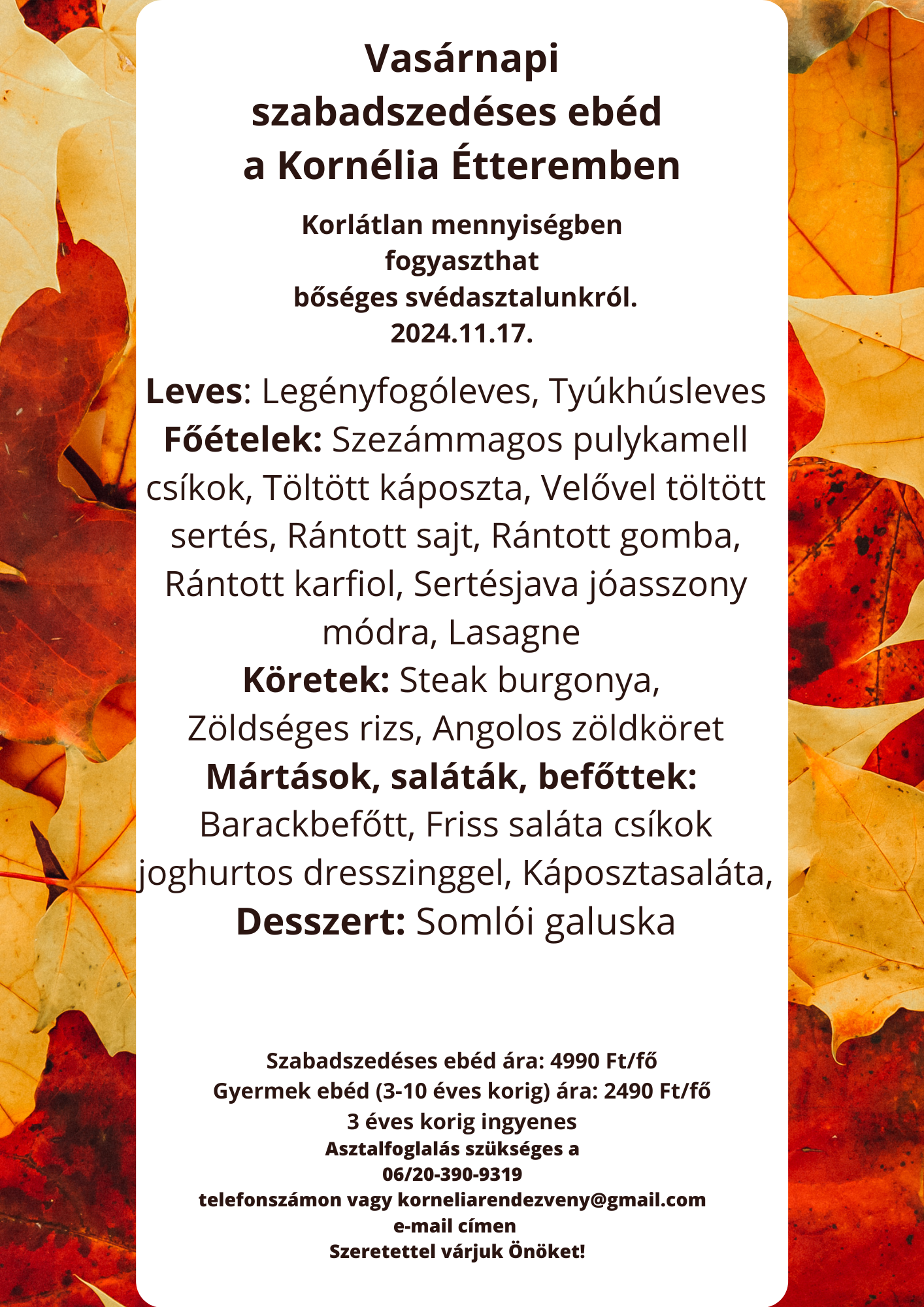 Asztalfoglalás szükséges a 06/20-390- 9319 telefonszámon vagy a korneliarendezveny@gmail.com email címen