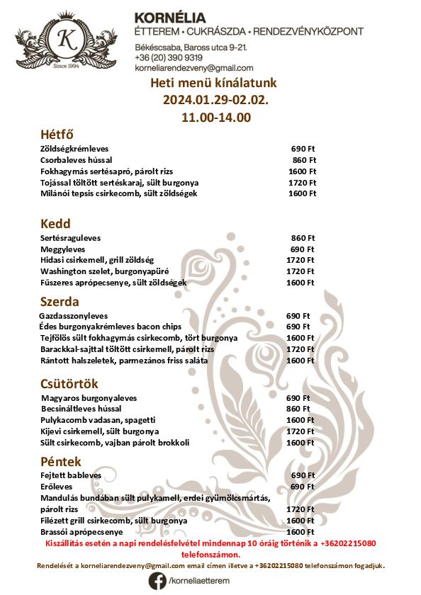Asztalfoglalás szükséges a 06/20-390- 9319 telefonszámon vagy a korneliarendezveny@gmail.com email címen